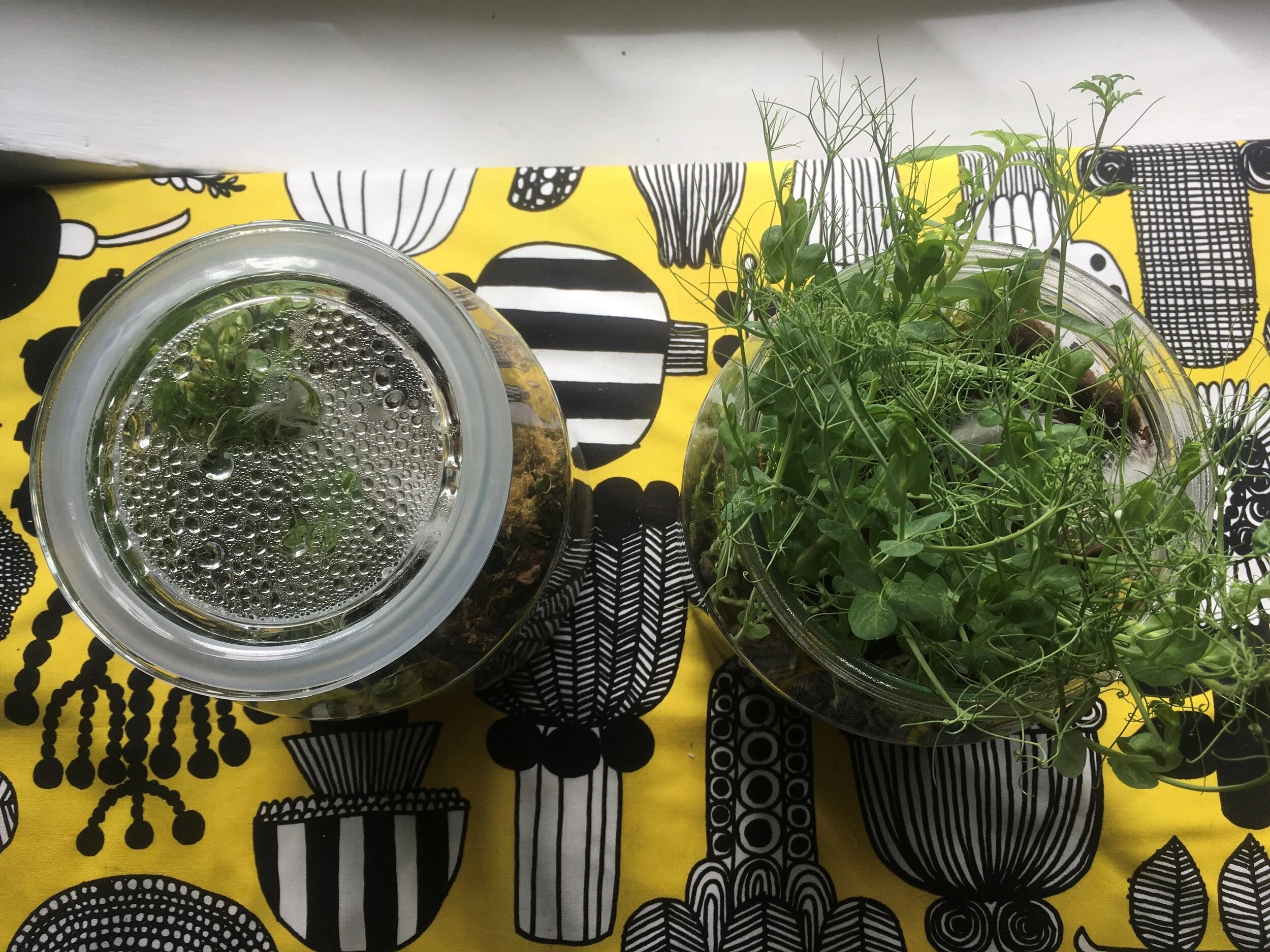 The three biospheres have undergone some significant changes during the past two weeks. The one which has been nurtured manually looks still pretty much the same as it did in week 3, but hints of mold are starting to show and some of the smaller sprouts are dying off.